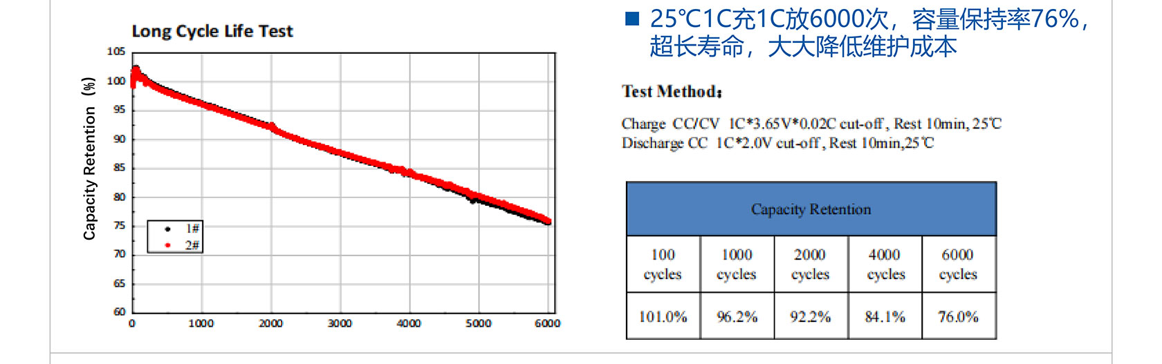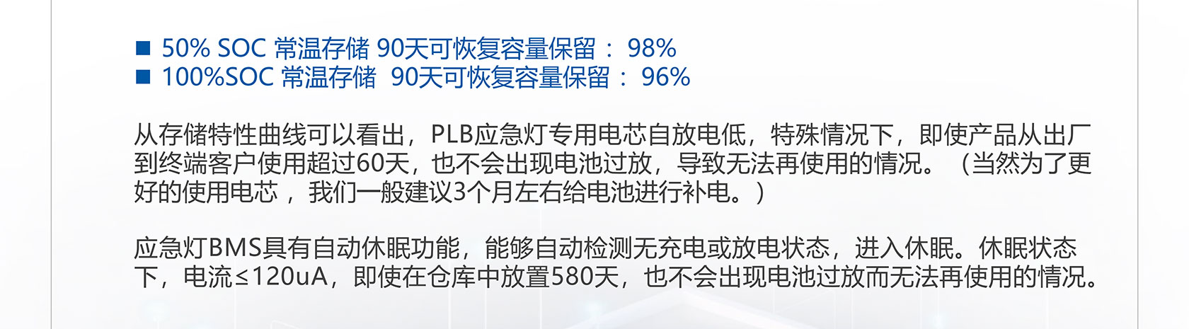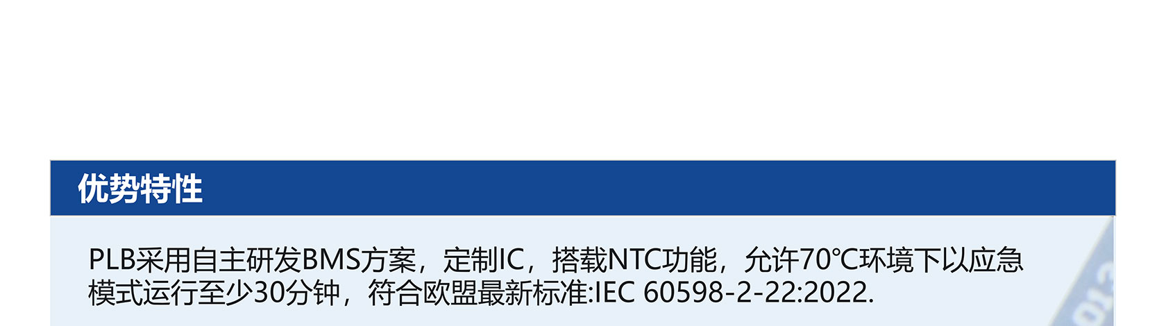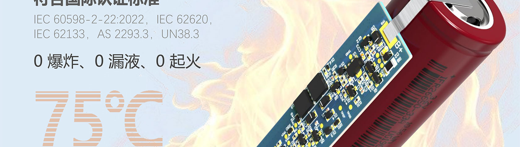 应急灯电池 十年寿命耐高温 规格参数 规格型号3.2V1800mAh-1S1P3.2V3600mAh-1S2P6.4V1800mAh-2S1P额定电压3.2V3.2V6.4V电池容量1800mAh3600mAh1800mAh电芯材料LiFePO4LiFePO4LiFePO4标准充电电流0.9A0.9A0.9A最大充电电流0.5C0.5C0.5C最大持续放电电流1C1C1C电池重量~ 50 g~ 100 g~ 100 g内阻≤40mΩ≤30mΩ≤40mΩ充电温度0℃~60℃0℃~60℃0℃~60℃放电温度-20℃~60℃-20℃~60℃-20℃~60℃成品尺寸70*19.5mm(不含线)70*40mm(不含线)70*40mm(不含线)循环寿命6000+6000+6000+BMS/NTC可选可选可选符合标准IEC 60598-2-22:2022,AS 2293.3,IEC62620 ,IEC62133 ,UN38.3电池数量 规格型号3.2V 3300mAh-1S1P3.2V 6600mAh-1S2P3.2V9900mAh-1S3P6.4V 3300mAh-2S1P额定电压3.2V3.2V3.2V6.4V电池容量3300mAh6600mAh9900mAh3300mAh电芯材料LiFePO4LiFePO4LiFePO4LiFePO4标准充电电流1.65A1.65A1.65A1.65A最大充电电流0.5C0.5C0.5C0.5C最大持续放电电流1C1C1C1C电池重量~ 100 g~ 200 g~ 300 g~ 200 g内阻≤40mΩ≤30mΩ≤20mΩ≤80mΩ充电温度0℃~60℃0℃~60℃0℃~60℃0℃~60℃放电温度-20℃~60℃-20℃~60℃-20℃~60℃-20℃~60℃成品尺寸70*32mm(不含线)70*64mm(不含线)70*62*62mm(不含线)140*32mm(不含线)循环寿命6000+6000+6000+6000+BMS/NTC可选可选可选可选符合标准IEC 60598-2-22:2022,AS 2293.3,IEC62620 ,IEC62133 ,UN38.3电池数量
