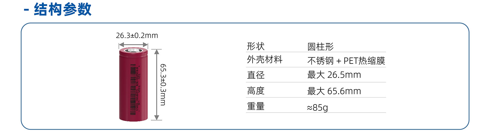 – 电池尺寸:直径26.3±0.2mm,高度65.3±0.3mm