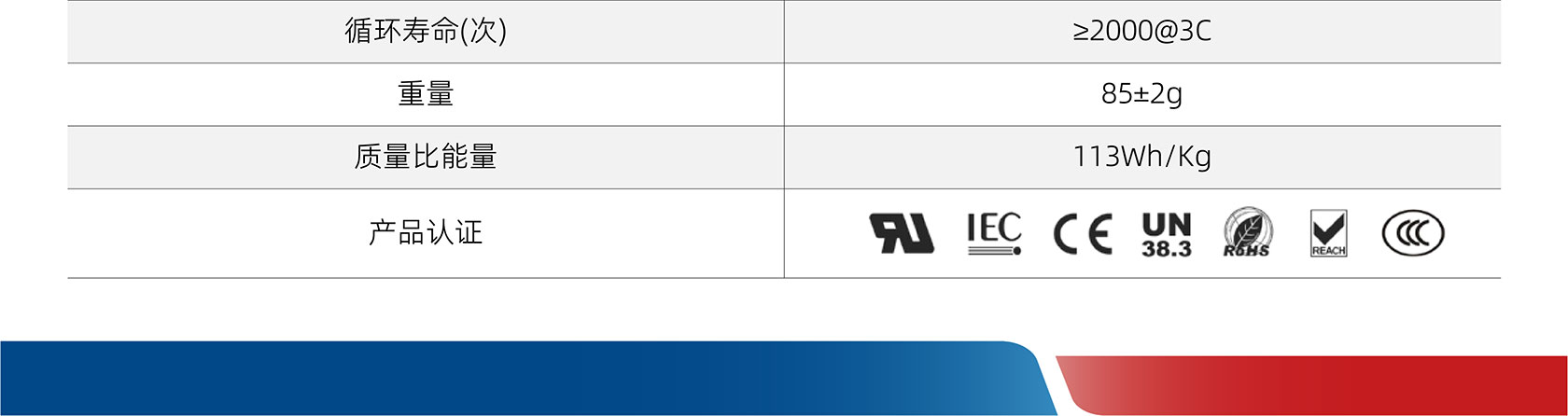 – 符合:UL1642、UL2054,UL1973、IEC62133、UN38.3、RoHS、REACH等认证标准。