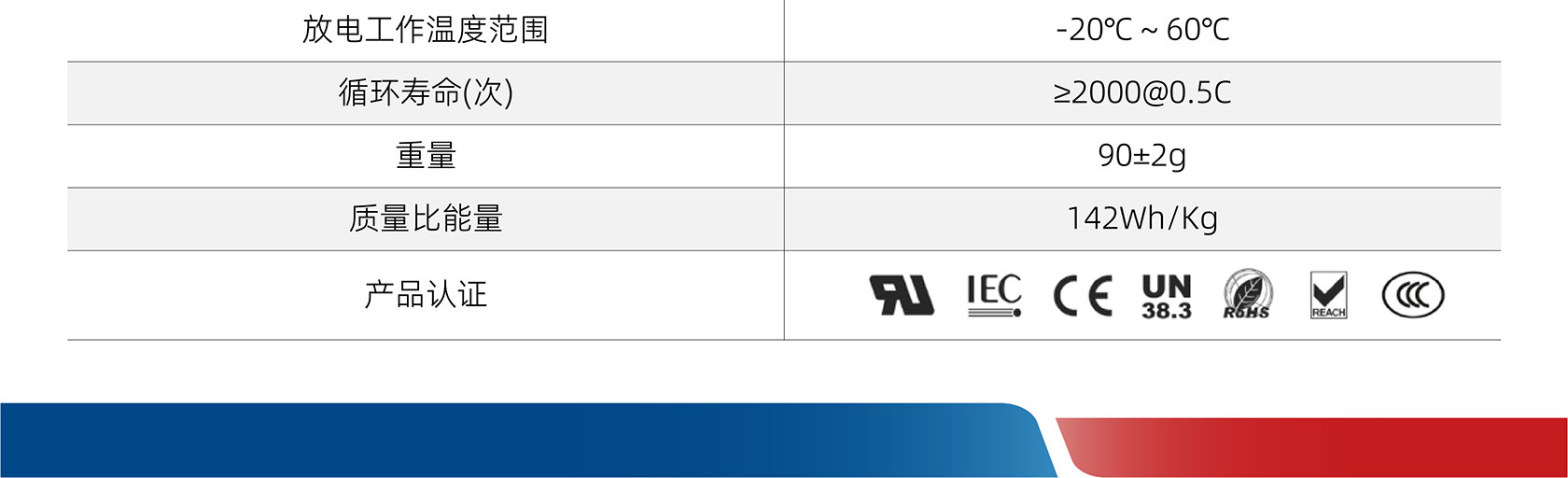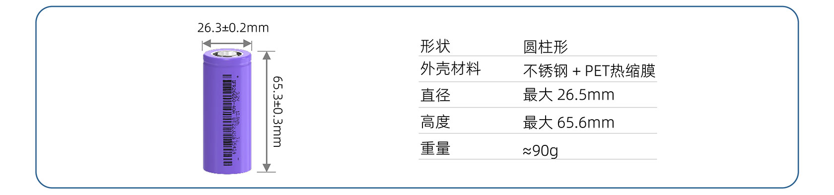 特点优势: – 长寿命:+/- 1C,100% DOD,循环超过2000次; – 高安全性、高一致性。 – 宽温度范围:-20℃至45℃ – 电池尺寸:直径26.3±0.2mm,高度65.3±0.3mm – 符合:UL1642、UL2054,UL1973、IEC62133、UN38.3、RoHS、REACH等认证标准。